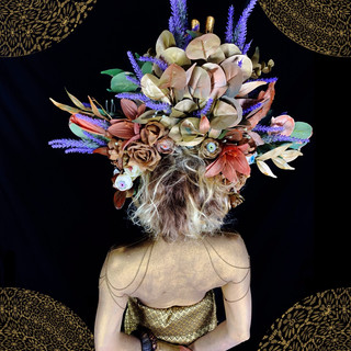 Create on a upcycled base , plastic and wood , upcycled flowers , upcyled wood hand that i collect many years ago in my old job as saler. Bracelet and tiare (headpiece) for the beautiful jess visual day .